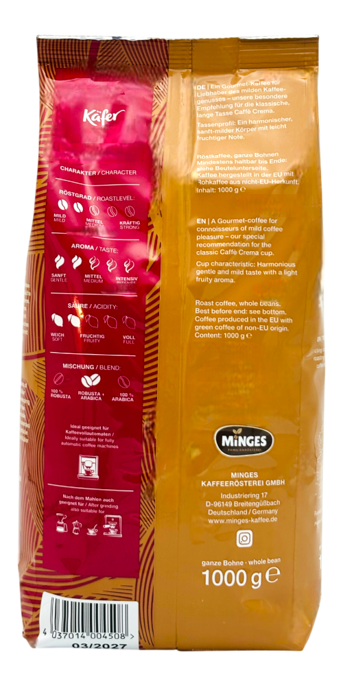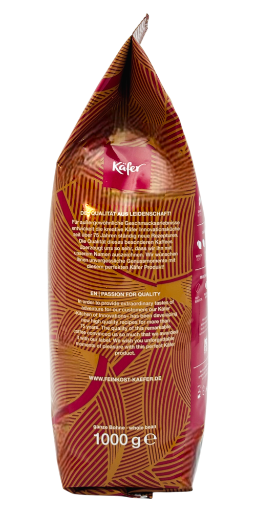 Käfer, het gerenommeerde Duitse koffiemerk, presenteert deze premium Caffè Crema Lungo blend van zorgvuldig geselecteerde Arabica en Robusta bonen uit Azië en Zuid-Amerika. De medium roast branding benadrukt de natuurlijke chocolade- en nootaroma's, terwijl de traditionele Duitse brandingstechnieken zorgen voor een perfecte balans en consistente kwaliteit.