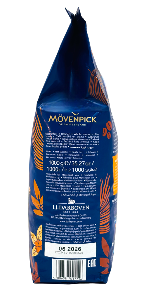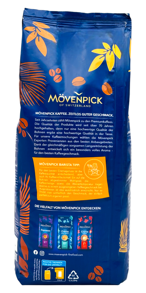 Ervaar 75 jaar Zwitserse koffiekunst met Mövenpick Caffè Crema Bonen. Deze premium arabica blend uit Afrika, Azië en Zuid-Amerika biedt een harmonieuze balans van rijke chocolade, subtiele nootsmaken en een romige, elegante afdronk. Perfect voor espresso én filterkoffie.