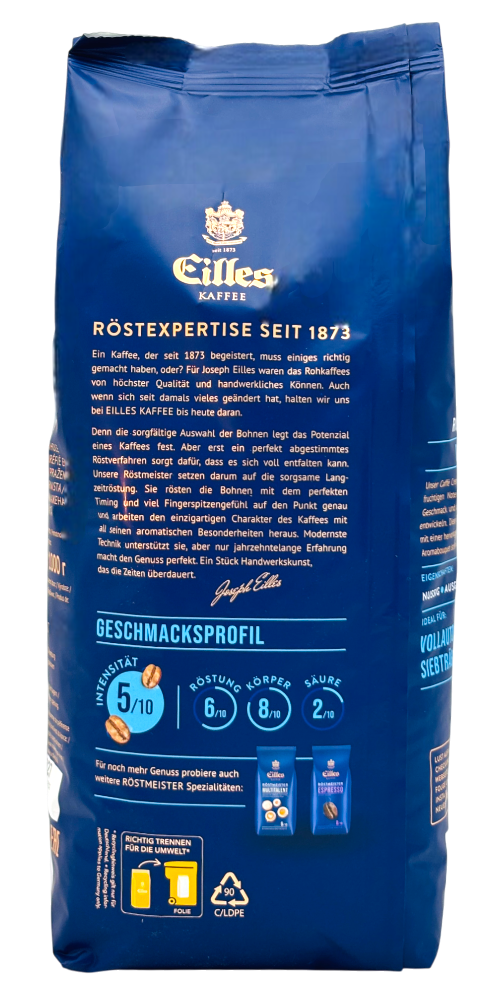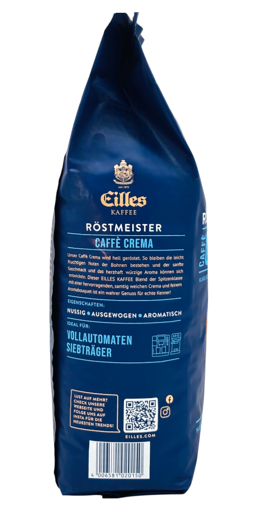 Eilles Caffè Crema Bonen vertegenwoordigen het beste van de Duitse koffietraditie sinds 1873. Deze premium blend combineert zorgvuldig geselecteerde Arabica en Robusta bonen in een medium roast profiel, wat resulteert in een perfect gebalanceerde koffie met diepe chocoladetonen en subtiele nootaccenten. De traditionele brandmethoden van Eilles zorgen voor behoud van natuurlijke aroma's en een consistente kwaliteit.