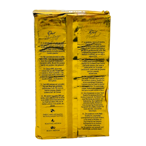 Discover Lavazza's legendary Qualita Oro - a premium 100% Arabica blend representing more than a century of Italian coffee tradition. This iconic ground coffee from Central and South America offers a refined harmony of fruity sweetness and floral elegance, perfect for espresso, filter coffee and French Press. A golden coffee experience that will delight connoisseurs and aficionados alike.