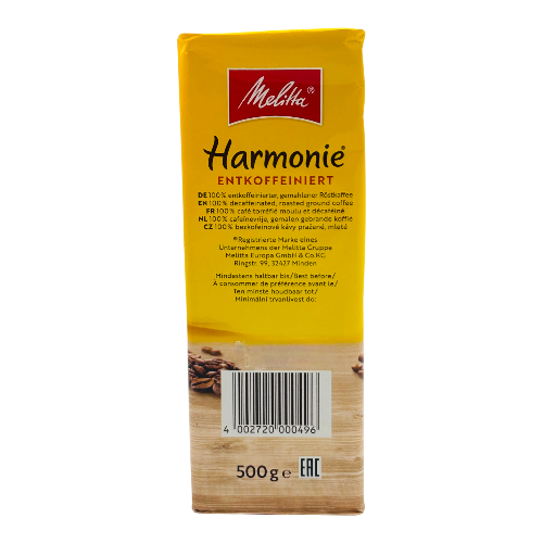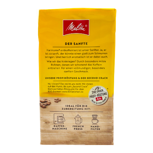 Discover the Melitta Harmonie Entkoffeiniert - a premium decaffeinated blend that proves decaf coffee can be full of flavor. This carefully crafted blend of Arabica and Robusta beans is naturally decaffeinated and medium roasted for a perfect balance of chocolate and nut flavors. Ideal for evening occasions or for coffee lovers sensitive to caffeine without compromising on quality and flavor.