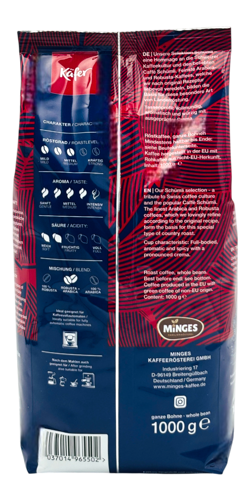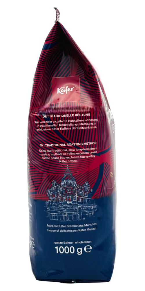 Käfer selecteerde deze premium blend van Arabica en Robusta bonen uit Afrika, Azië en Zuid-Amerika. De medium branding benadrukt de natuurlijke smaken en zorgt voor de kenmerkende rijke, fluweelachtige crema. Sinds 1930 staat Käfer voor culinaire verfijning en vakmanschap, wat duidelijk merkbaar is in deze zorgvuldig samengestelde koffieblend.