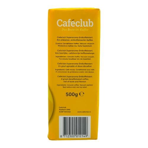 Cafeclub's Superaroma Entkoffeiniert Gemalen is een meesterlijke blend van zorgvuldig geselecteerde Arabica en Robusta bonen uit Afrika, Azië en Zuid-Amerika. Deze premium cafeïnevrije koffie wordt medium gebrand in Nederland en draagt het Rainforest Alliance-certificaat als bewijs van ethische en duurzame productie. De geavanceerde decafeïneringsmethode behoudt de natuurlijke smaken en aroma's van de oorspronkelijke bonen.